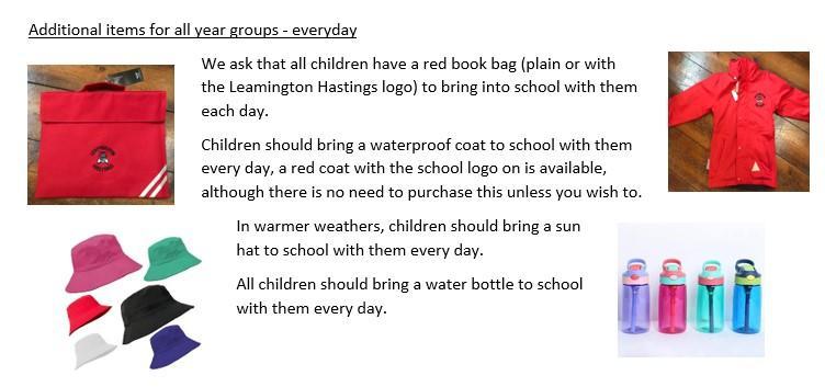 All items with a school logo are available to buy from the Webb Ellis Uniform Shop in Rugby: http://www.webb-ellis.co.uk/schools/infant-schools/leamington-hastings-infant-school/ , from Andrew Hyde: https://ahyde.co.uk/collections/leamington-hastings or second hand through the school office. Please contact the school office for the most up to date list of school stock. There is no expectation that branded uniform is worn, children are welcome to wear unbranded uniform.