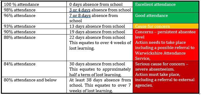 If your child is absent through sickness, or any unavoidable cause, please contact the academy by telephoning 01926 632359 by 9.00am on the first day of absence. This will be marked as an authorised absence.