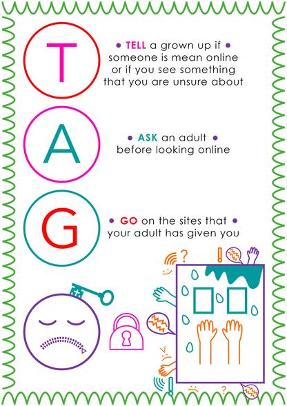 In an increasingly technological world, children are often accessing technology with the ability to access the internet from a young age. We teach esafety through our bespoke acornym of 'TAG'. In Early Years, children learn to 'Tell A Grown up', with this progressing to 'Tell Ask Go' in Key Stage One, promoting the safe use of technological devices that can access the internet. Our bespoke posters which were designed by children in the school can be seen below.