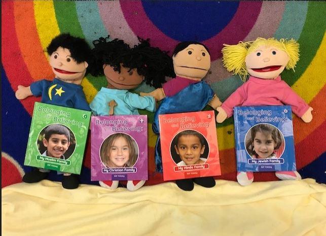 Within our R.E. curriculum, starting in the Early Years, children are introduced to the Persona dolls of Imran, Grace, Samit and Hannah, representing world views from the Christian, Jewish, Muslim and Hindu faiths.